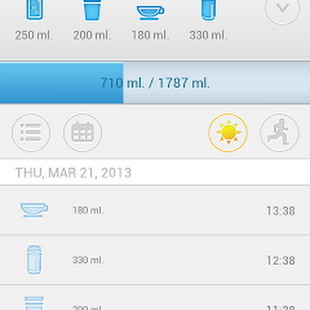 Water consumption calculator suggests you a goal to reach each day and customized personal hydration plan reminds you never to forget to drink. The drinking history graphs gives you an overview of your daily and monthly drinking habits.