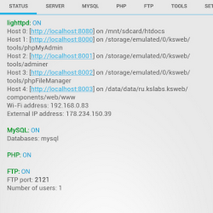 Operating our application is very simple. In order to start the server you only need to run our application, select, if necessary, port and the root directory. By default, KSWEB contains a fully functional configuration file of the server, PHP and MySQL. However, if you want to change them, go to the server options and click on the item “External INI”. Configuration files will be moved to SD-card of your device at “…/sdcard/ksweb/conf/”.