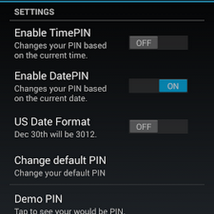 TimePIN is a security and ease of use enhancing application. TimePIN sets your lockscreen PIN code to the current time or date resulting in an ever changing PIN that can not be shoulder surfed or repeated due to fingerprints on the screen. Modifiers allow you to morph the PIN, to further enhance security.