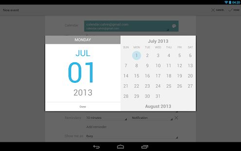 The Calendar app displays events from each of your Google Accounts that synchronizes with your Android device. You can also:
