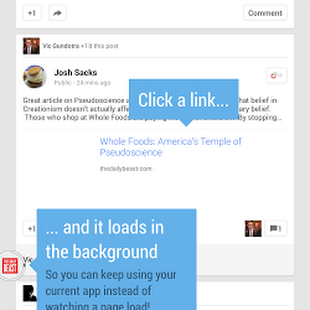 • When you click on a link in an app, Link Bubble loads that webpage in the background, leaving you free to keep using your current app rather than your precious time being wasted watching a page load. Once the page has fully loaded, it will animate on screen.