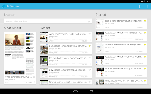 Shorten long URLs and squeeze them into fewer characters to make links easier to share, tweet, or email to friends. Using a shortened URL leaves more room to say what’s on your mind. For example, http://goo.gl/n7IMF2 is a convenient shorthand representation for the long link https://play.google.com/store/apps.