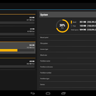 DiskInfo is a unique app that lists all partitions and all mount points on you device. It shows disk usage and very detailed partition and storage information. It also displays total and free memory (RAM) and Swap (e.g. zRam).