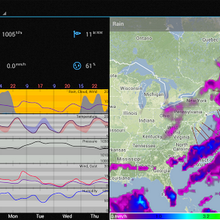 The map view give smooth scrolling through 7 days of data. The graph view gives the weeks rain, wind and cloud forecast at a glance. Forecast data includes rain, wind, cloud, temperature, pressure humidity and wave height (for fishermen and surfers).