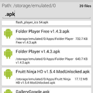 This is a simple to use file search app for Android 4.x, that enables the user to search all of the available storage attached to their device, both internal and external, including an installed SD Card (slot), as well as the Root (Donate version).